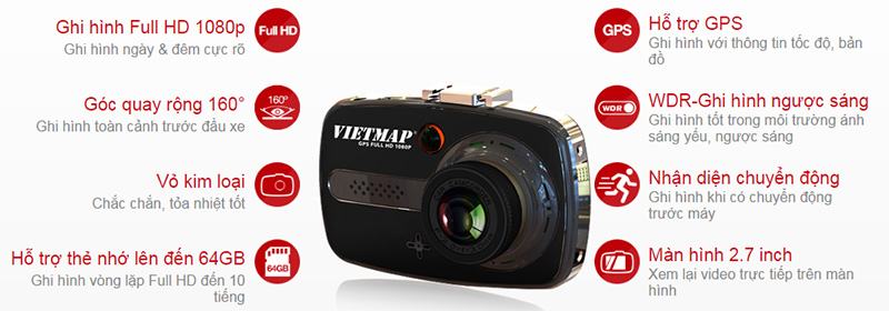 Camera hành trình Vietmap X9 thiết kế vỏ kim loại, màn hình 2.7 inch ghi hình Full HD 1080p siêu rõ nét cả ngày và đêm. Ghi hình với thông tin tốc độ trực tiếp trên video. Kết nối trực tiếp với màn hình DVD trên xe qua cổng AV-out.
